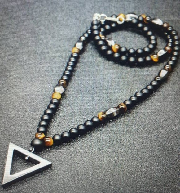 🔺 メンズネックレス(三角形のペンダント付き)- タイガーアイとマットブラックアゲート